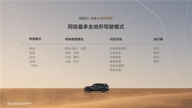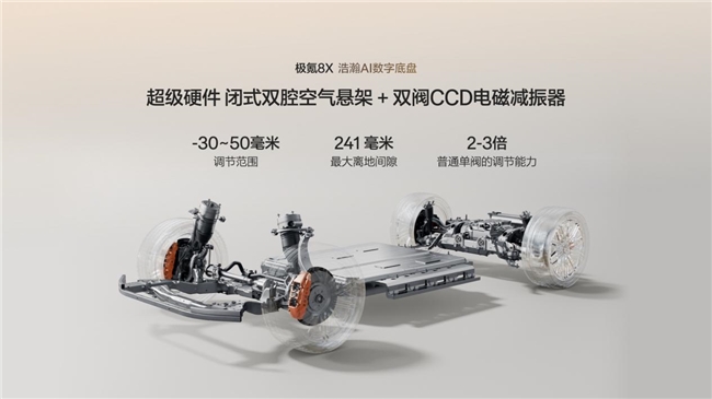 极氪8X搭载的浩瀚AI数字底盘,是国内首个获得4S级认证的智能底盘系统——安全、舒适、驾控、便捷四大维度均达S级标准。定海智能中枢以毫秒级频率调整悬架阻尼与车身姿态,配合同级唯一的闭式双腔空气悬架、双阀CCD电磁减振器和主动稳定杆,实现了“一车千面”的乘坐体验。